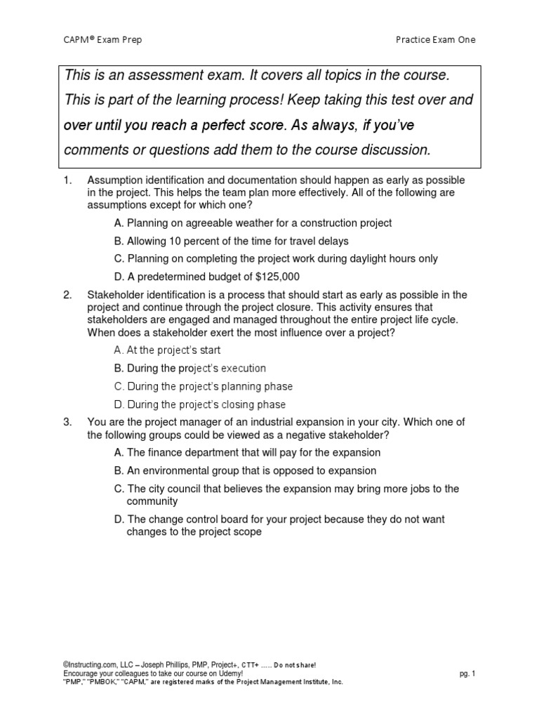 CAPM Practice Exam (PMBOK Guide 6th Edition) with Complete Solutions ...