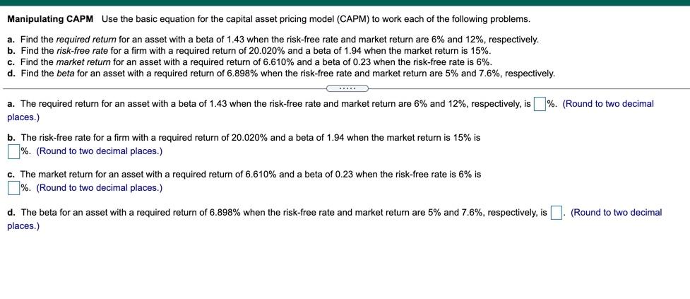 Solved Manipulating CAPM Use the basic equation for the | Chegg.com