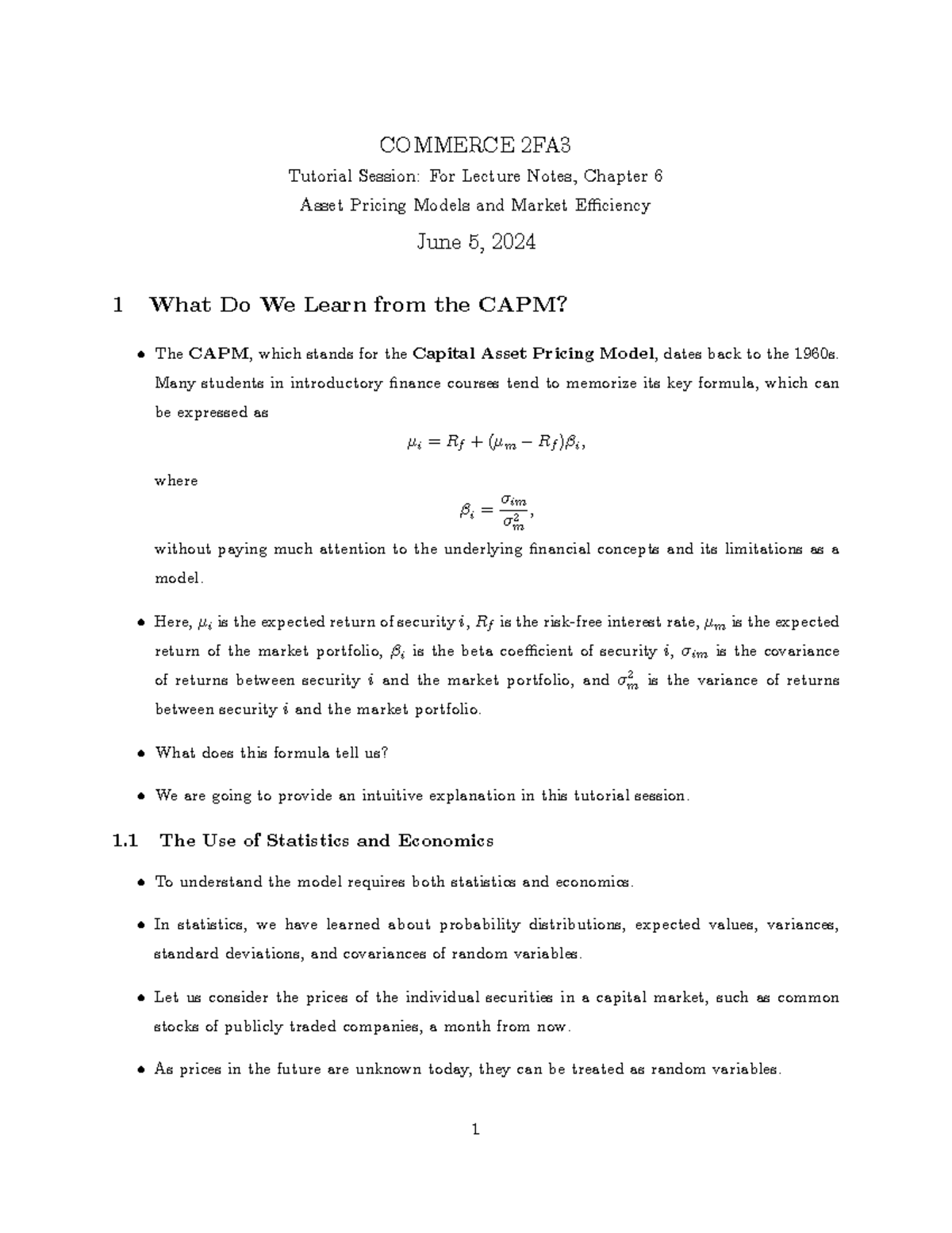 CAPM & Factor Models 2 - Lecture notes 3 - Capital Asset Pricing Model ...