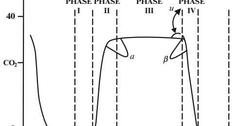 Illustration of a capnogram waveform and its phases and angles. Phase 1 ...