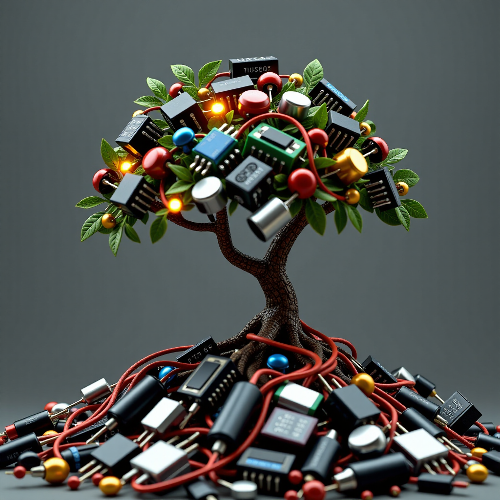FLUX prompt: a tree growing through a pile of e-waste, it...