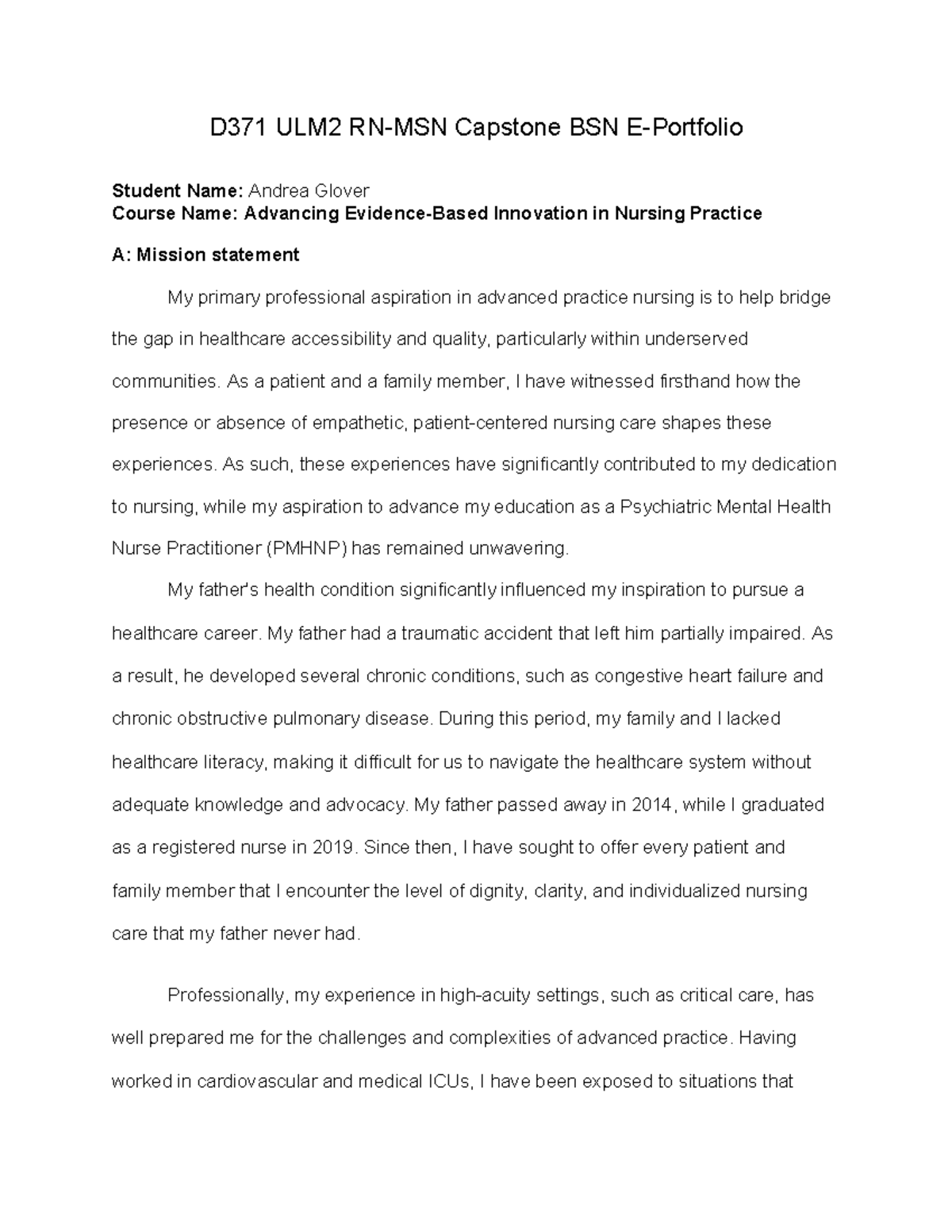 D371 ULM2 Capstone: BSN E-Portfolio of Andrea Glover (2026) - Studocu