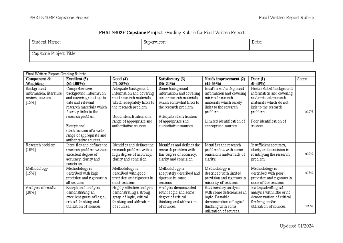PHSI N403F Capstone Project Final Written Report Grading Rubric - Studocu