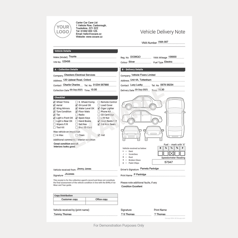 Vehicle Delivery & Handover Note UK | Fillable A4 PDF Template – Docuqo
