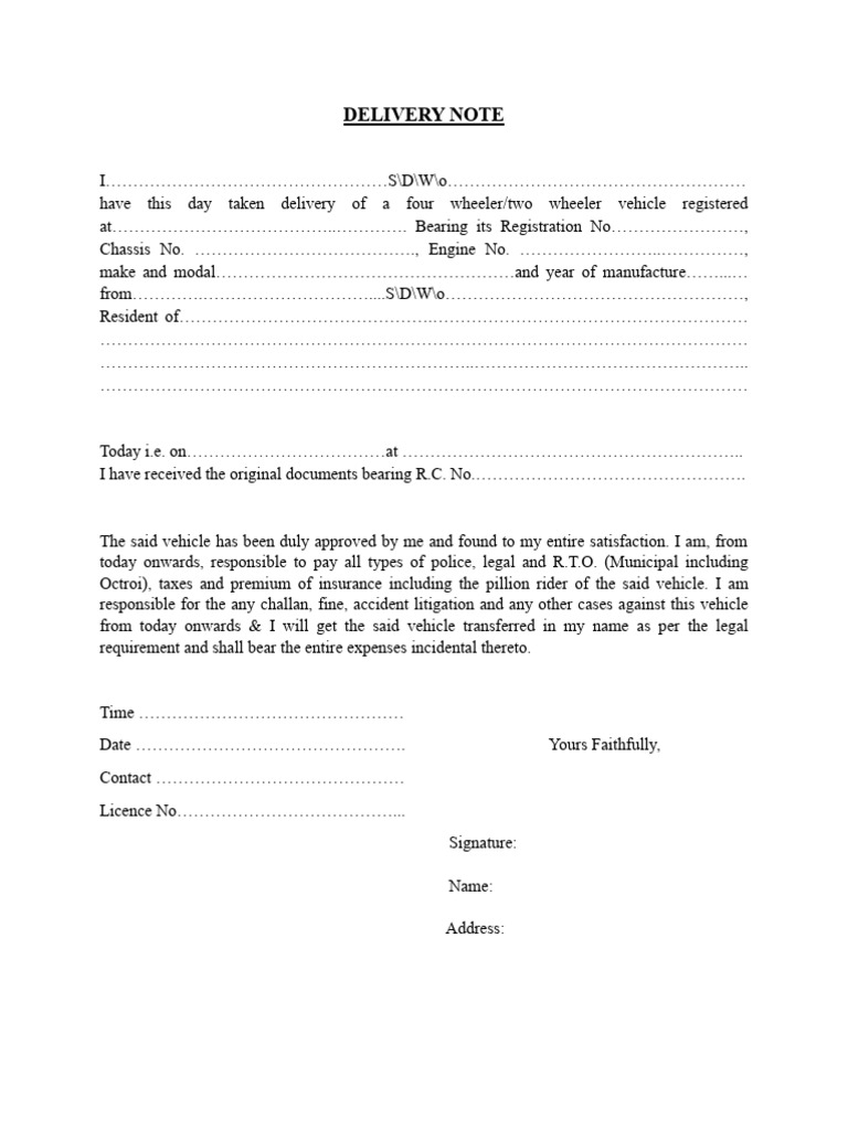 Vehicle Delivery Note Template | PDF | Vehicles | Transport
