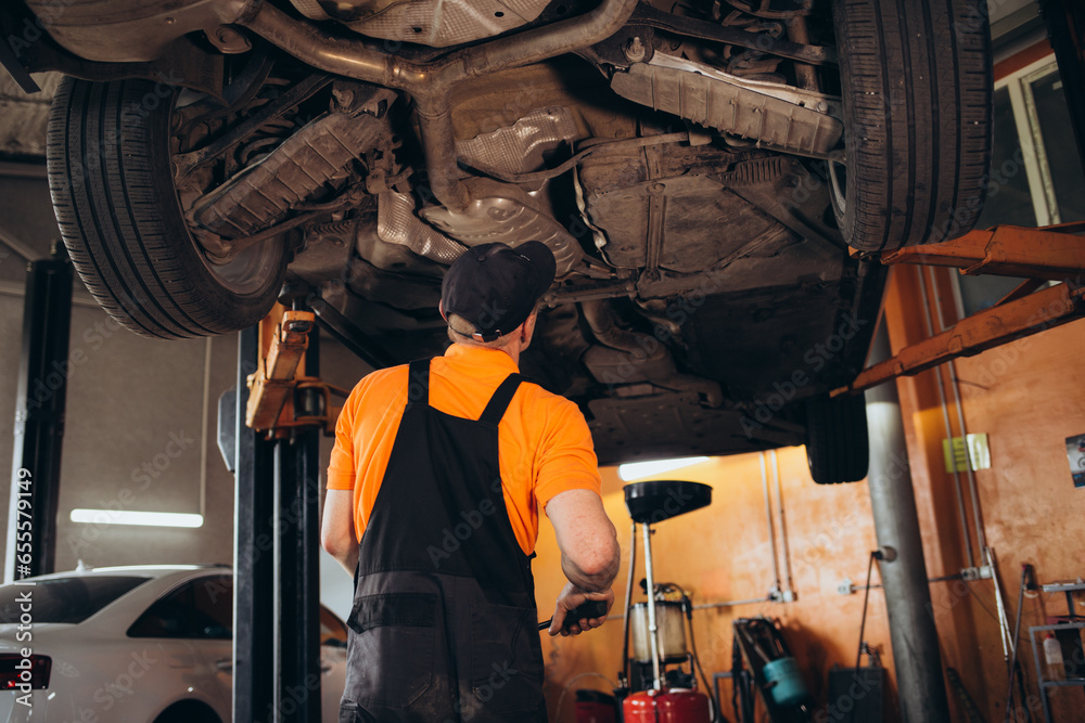Mechanic repairing a car, Mechanic inspects car suspension system and ...