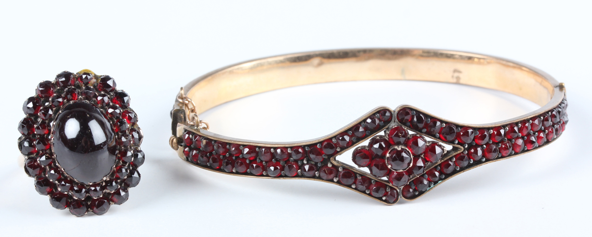 A Bohemian and carbuncle garnet oval cluster ring, unmarked, ring ...