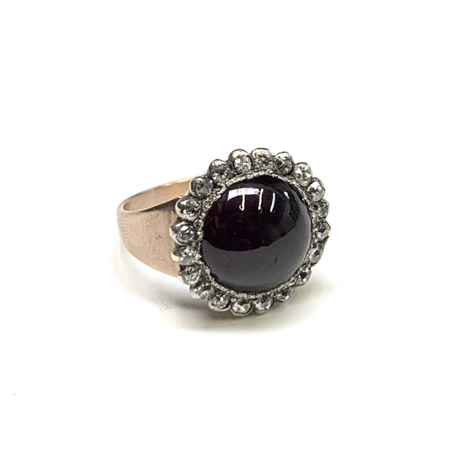 A 19th century precious yellow metal, carbuncle and diamond set ring ...