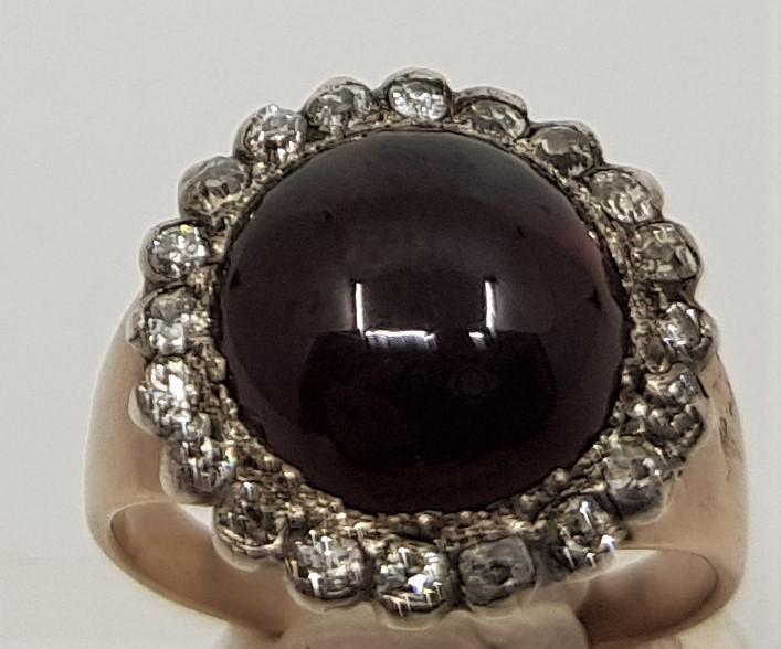 Garnet carbuncle and diamond ring on 14ct gold band with letter written ...
