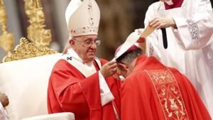 Pope Francis places the Cardinal's hat on the head of the new Cardinal ...