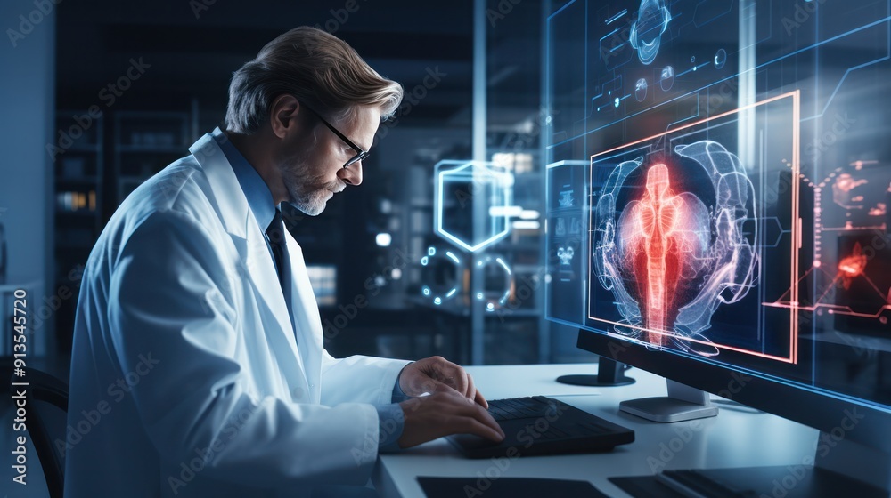 Cardiologist in a white lab coat examining a patient heart functions ...