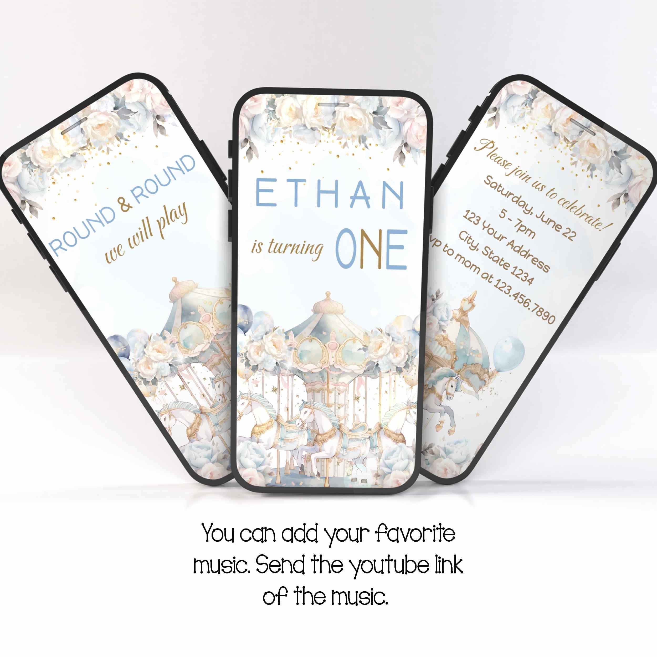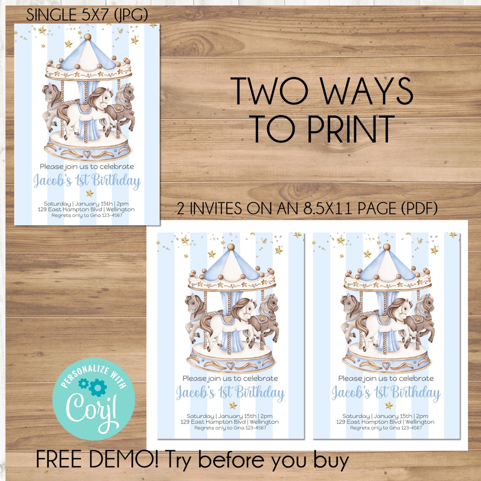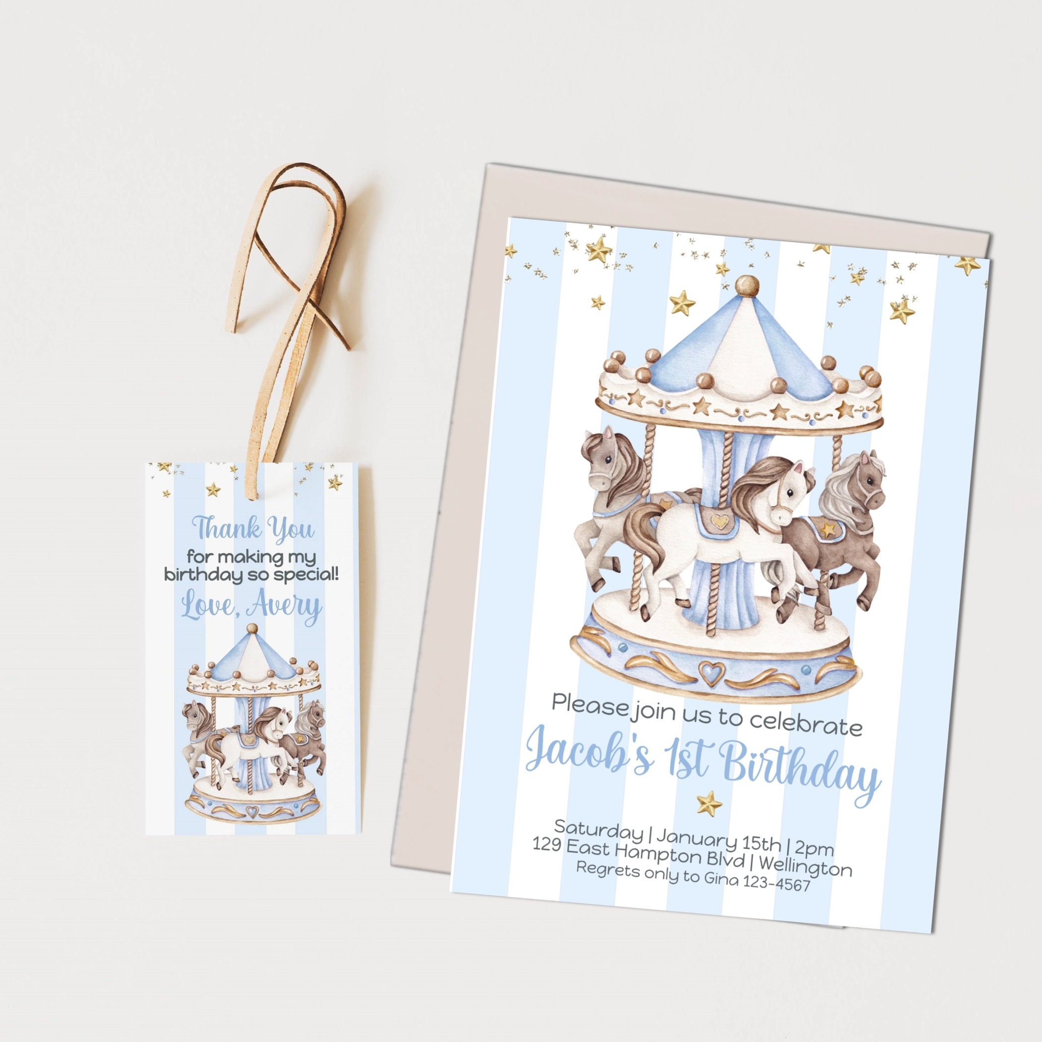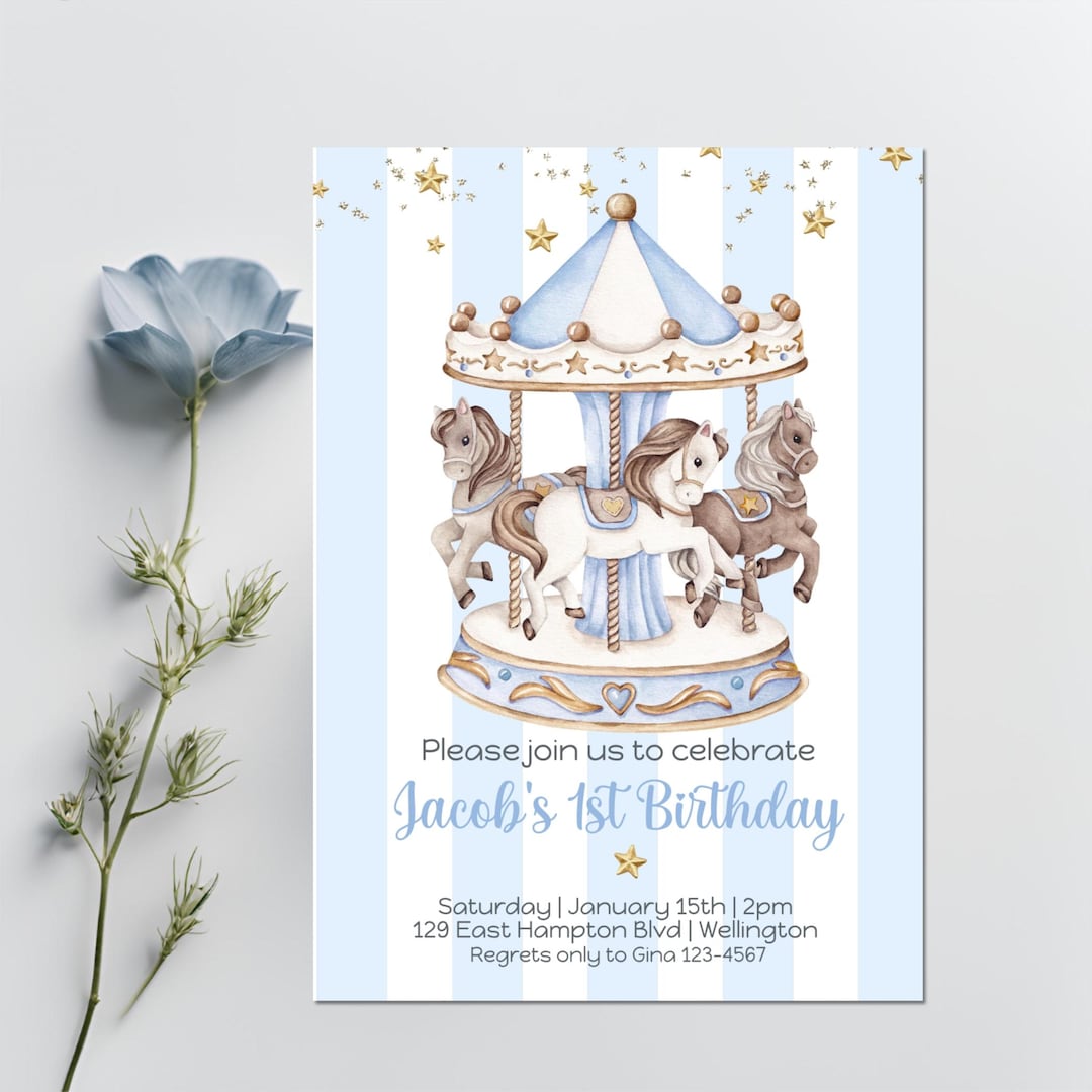 Editable 1st Birthday Carousel Invitation, Blue Carousel, Carousel ...