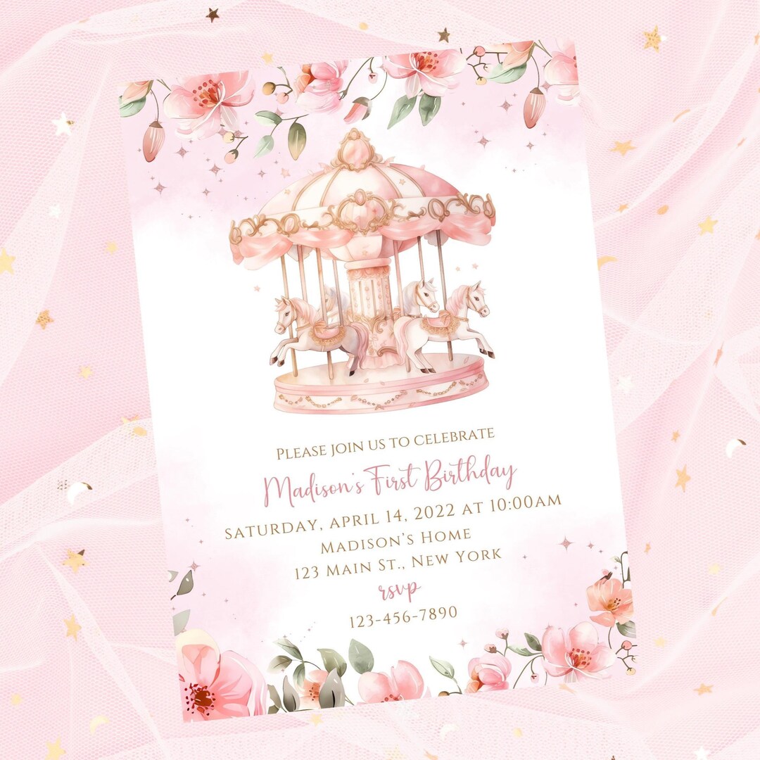 Editable Floral Carousel First Birthday,carousel Birthday Invitation ...