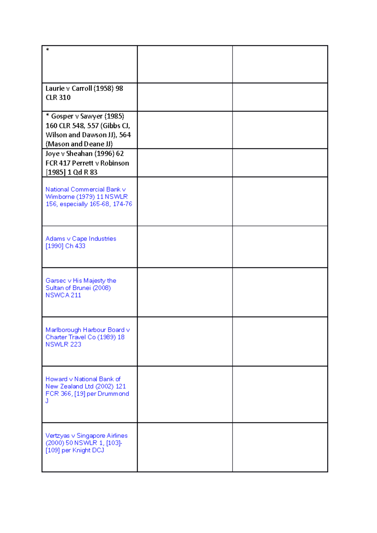 Case list' - Case list for study - * Laurie v Carroll (1958) 98 CLR 310 ...