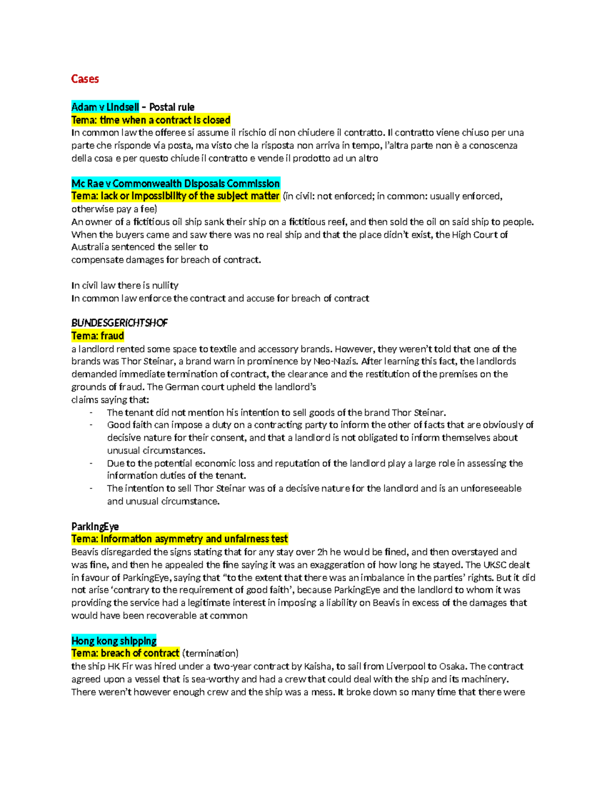 Cases - Lecture notes - Cases Adam v Lindsell – Postal rule Tema: time ...