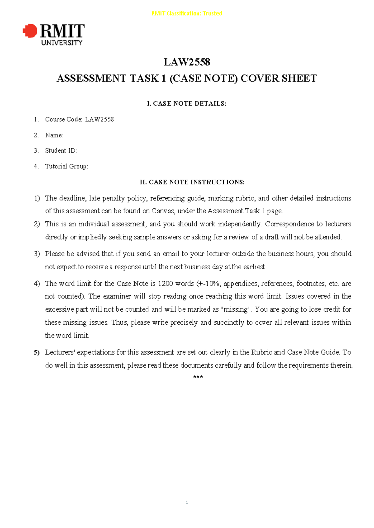 Task 1 - Case Note Question - 1 LAW ASSESSMENT TASK 1 (CASE NOTE) COVER ...