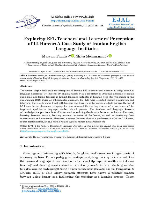 (PDF) Exploring EFL Teachers' and Learners' Perception of L2 Humor: A ...