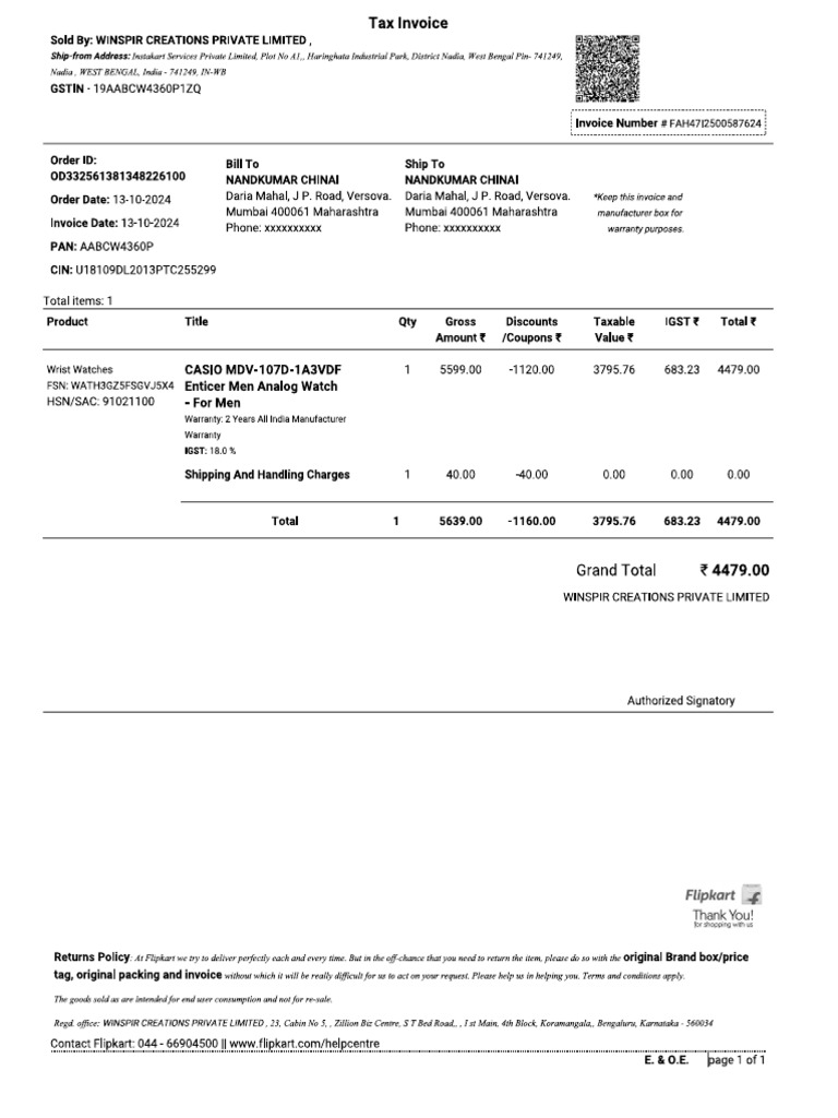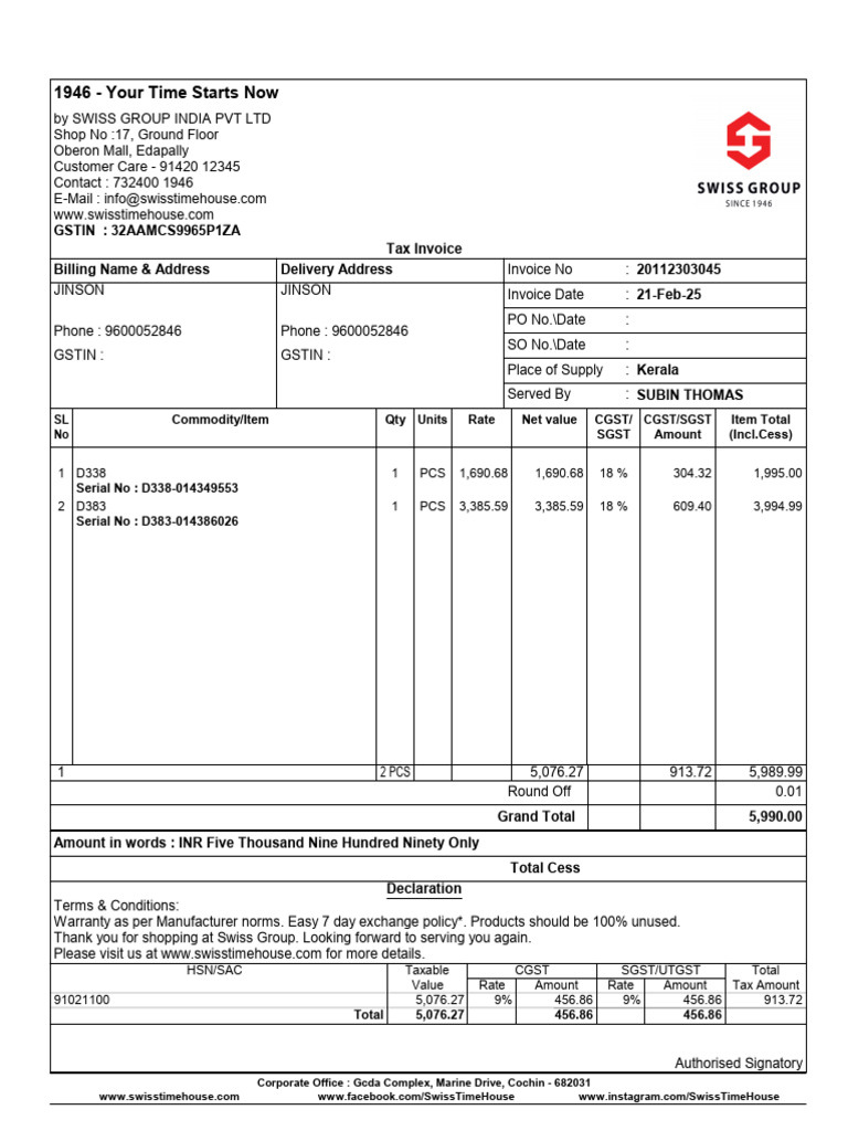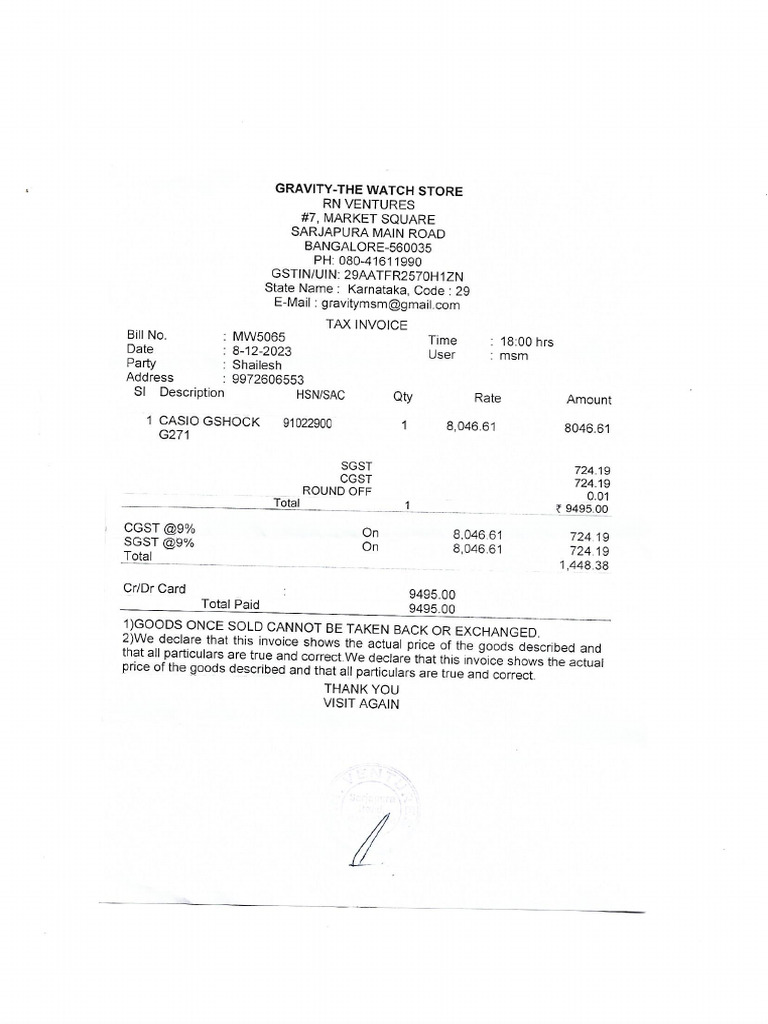 Tax Invoice for CASIO Watch Purchase | PDF | Public Finance | Taxes