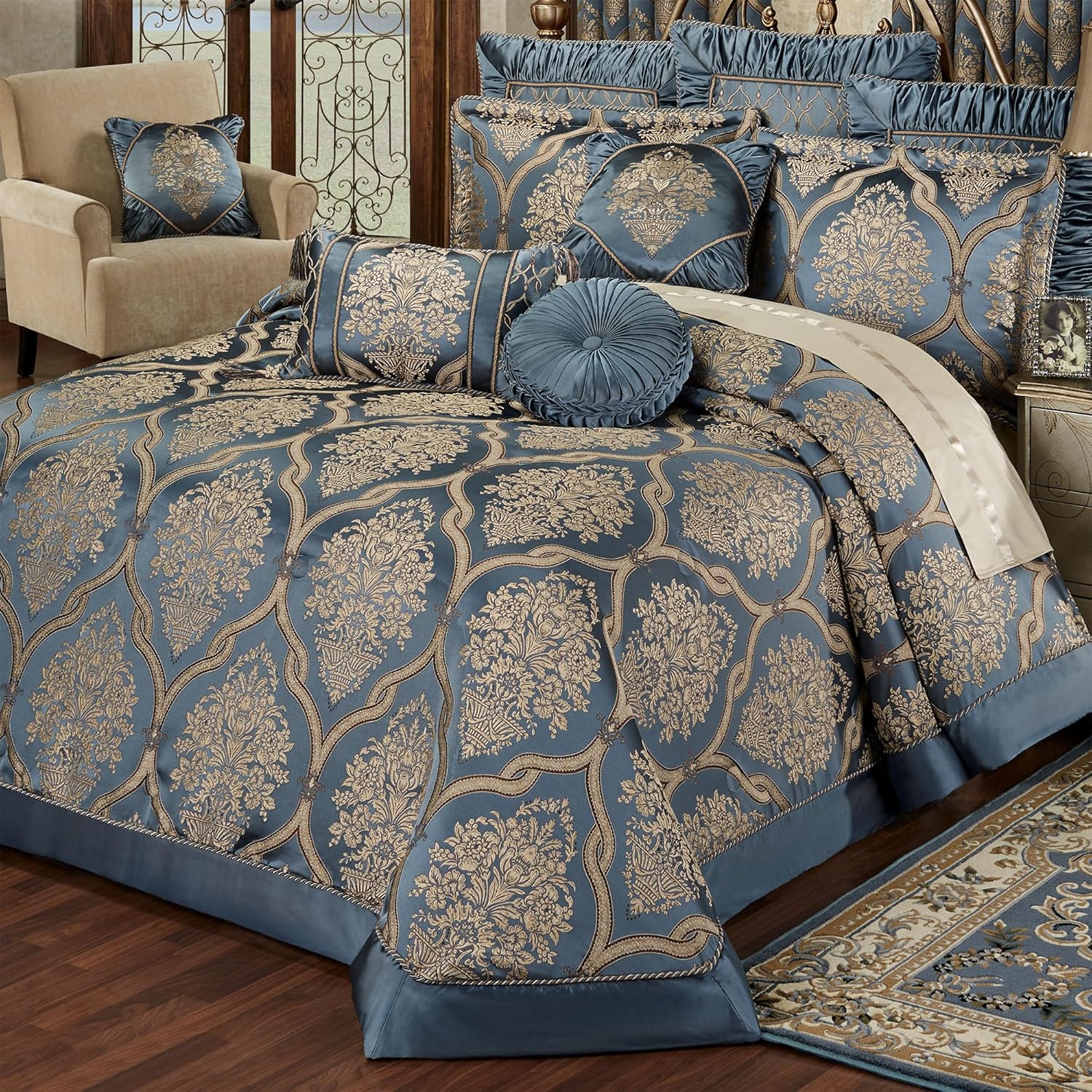 Castleton Damask Medallion Steel Blue Comforter Set Luxury Bedding