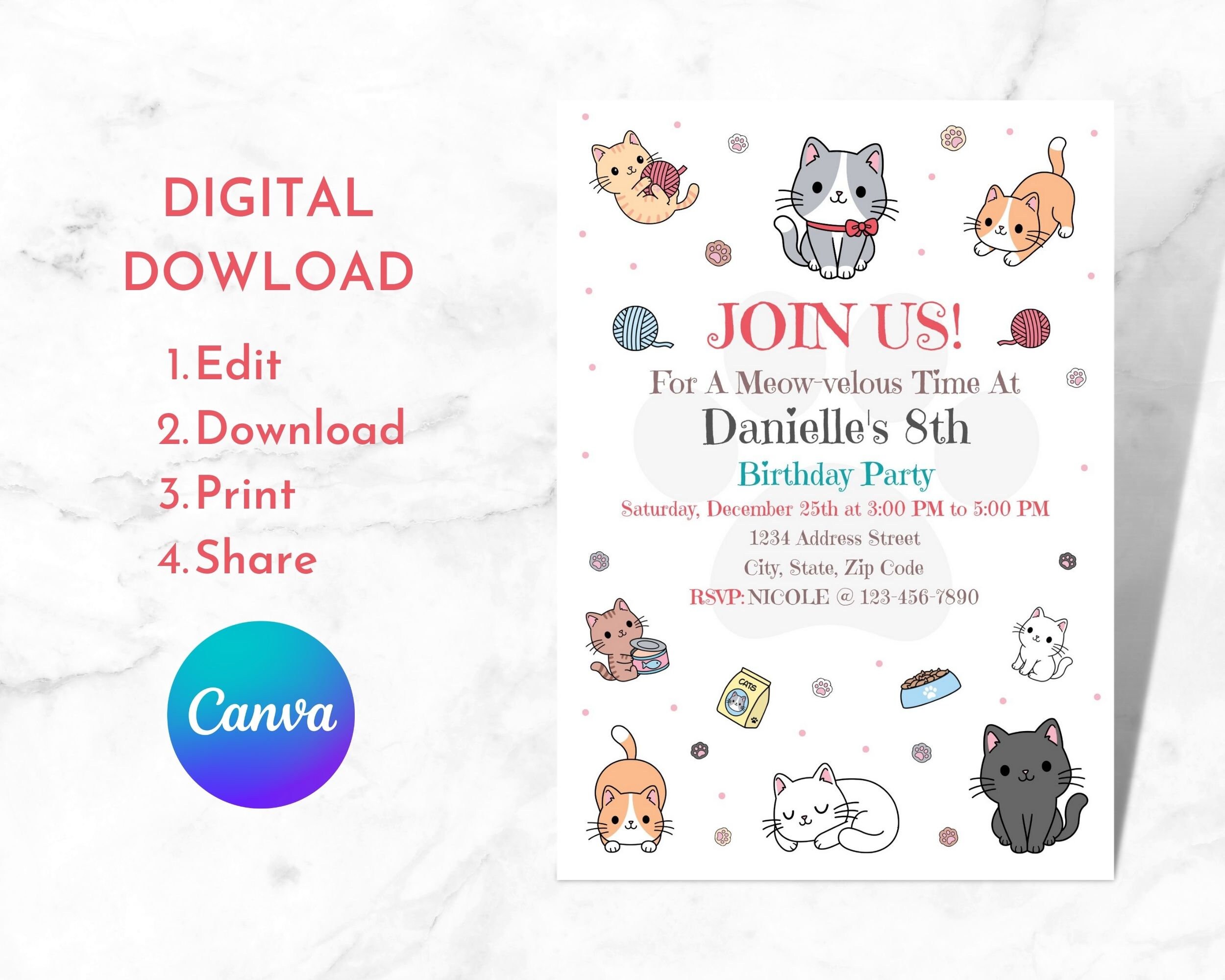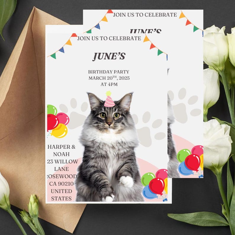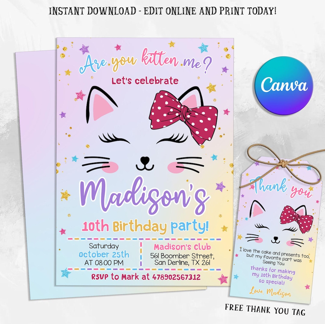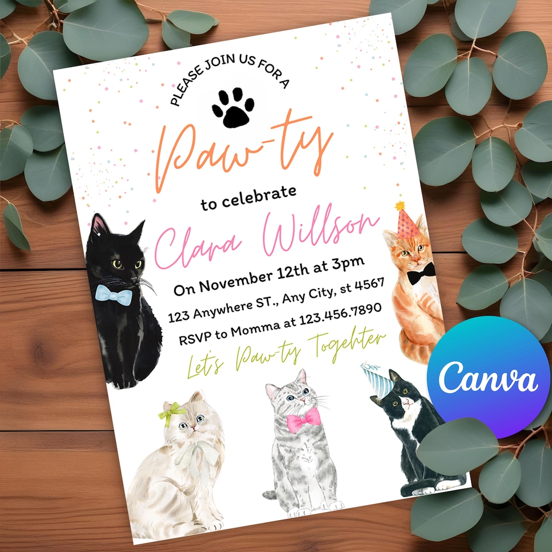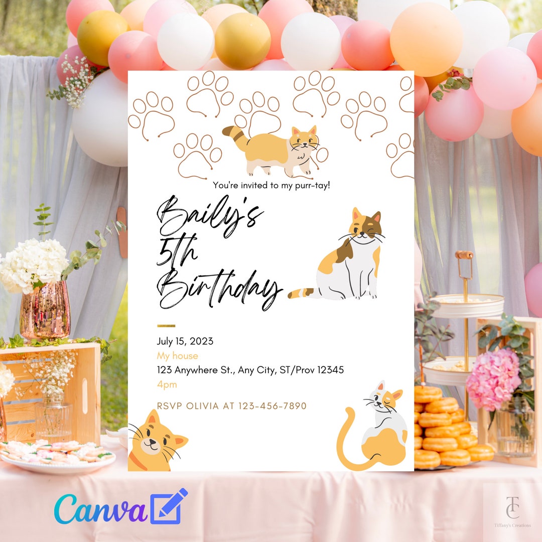 Editable Cat Invitation, Birthday Invitation, Digital, Printable ...