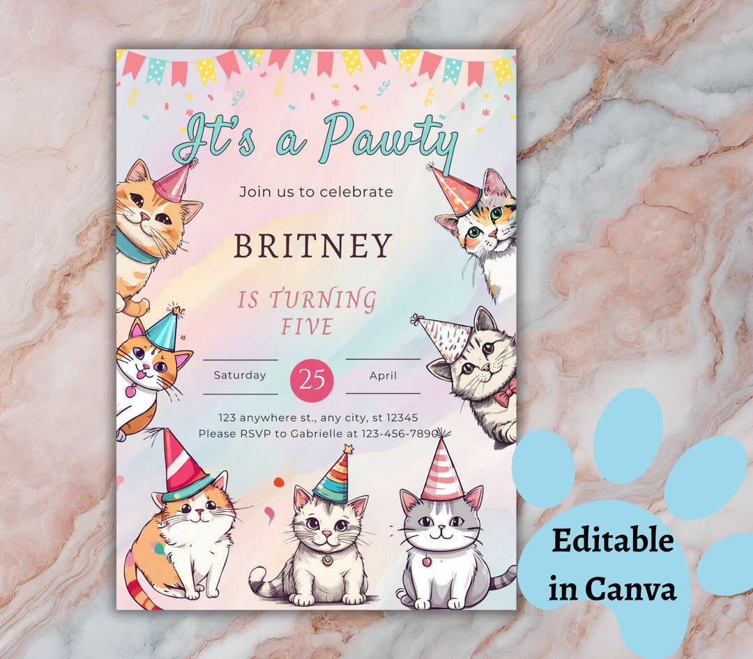 Cat Themed Birthday Pawty Invitation Template, Editable Cat Birthday ...