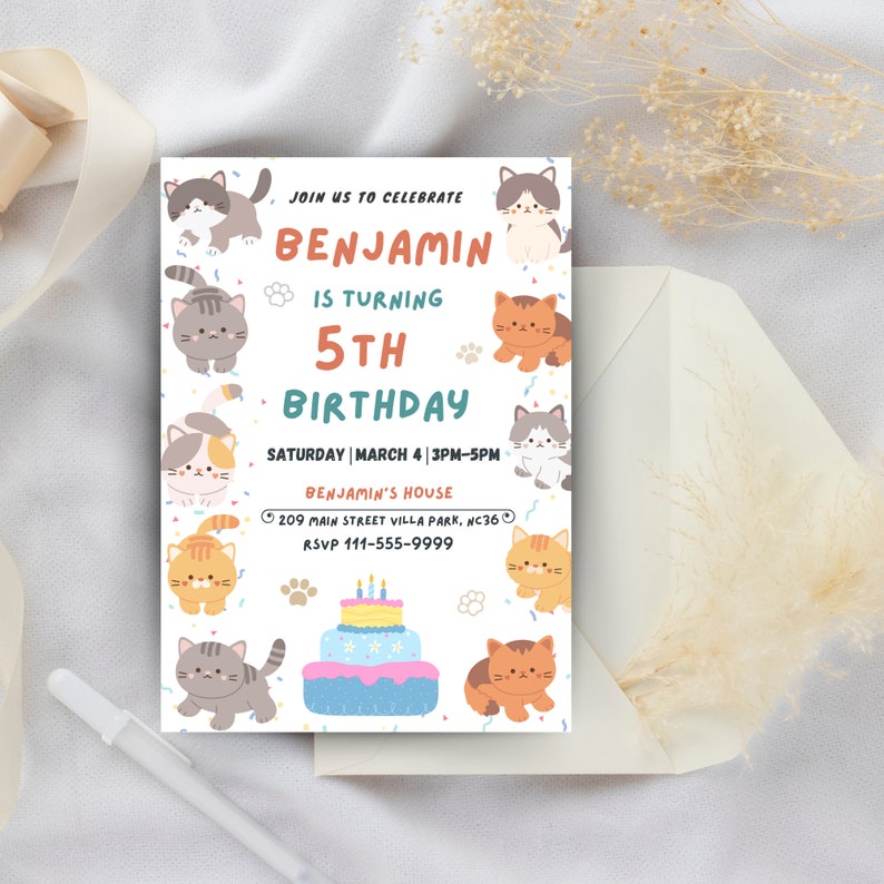 Cat Birthday Invitation: Editable Kitten Party Template (5x7 Size) - Etsy
