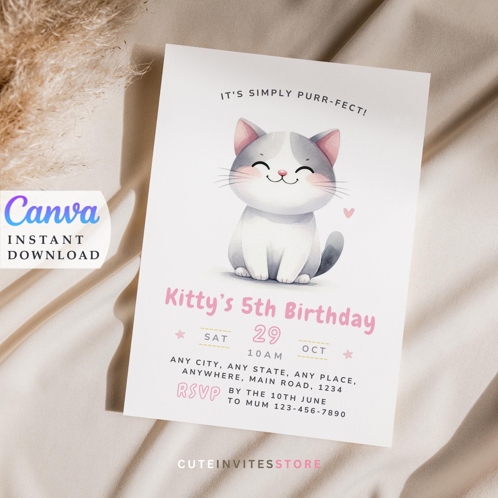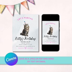 Cat Birthday Invitation, Printable Kitten Invite, Digital Invitation ...