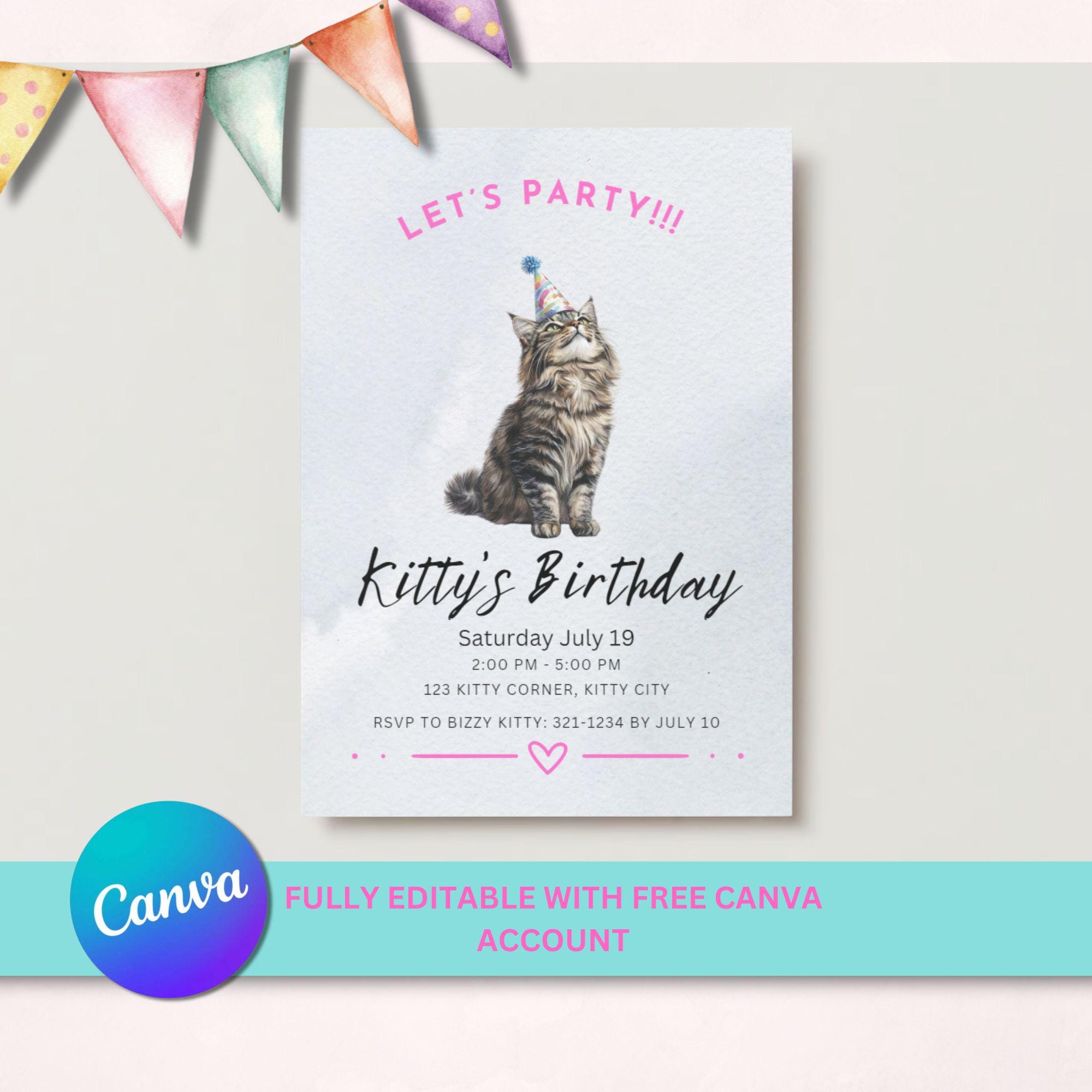 Kitty Cat Birthday Party Invitation, Cute Feline Celebration, Editable ...