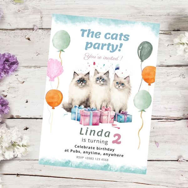 Editable Cat Invitation, Cute Cats Birthday Invite, Digital Kitty Cat ...