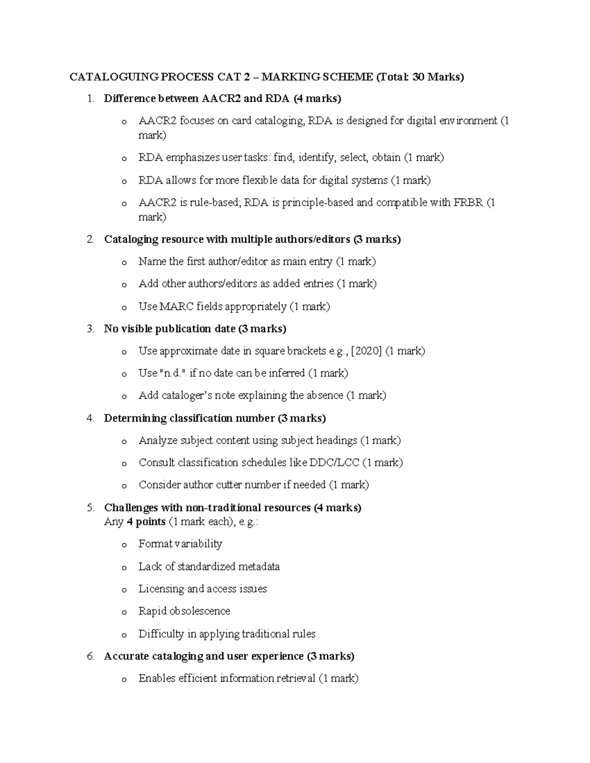 Cataloguing Process CAT 2 Marking Scheme (30 Marks) - Studocu