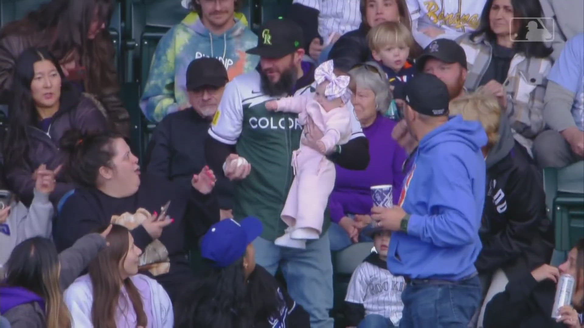 Rockies fan catches foul ball while holding baby daughter | 9news.com