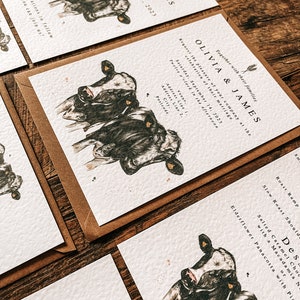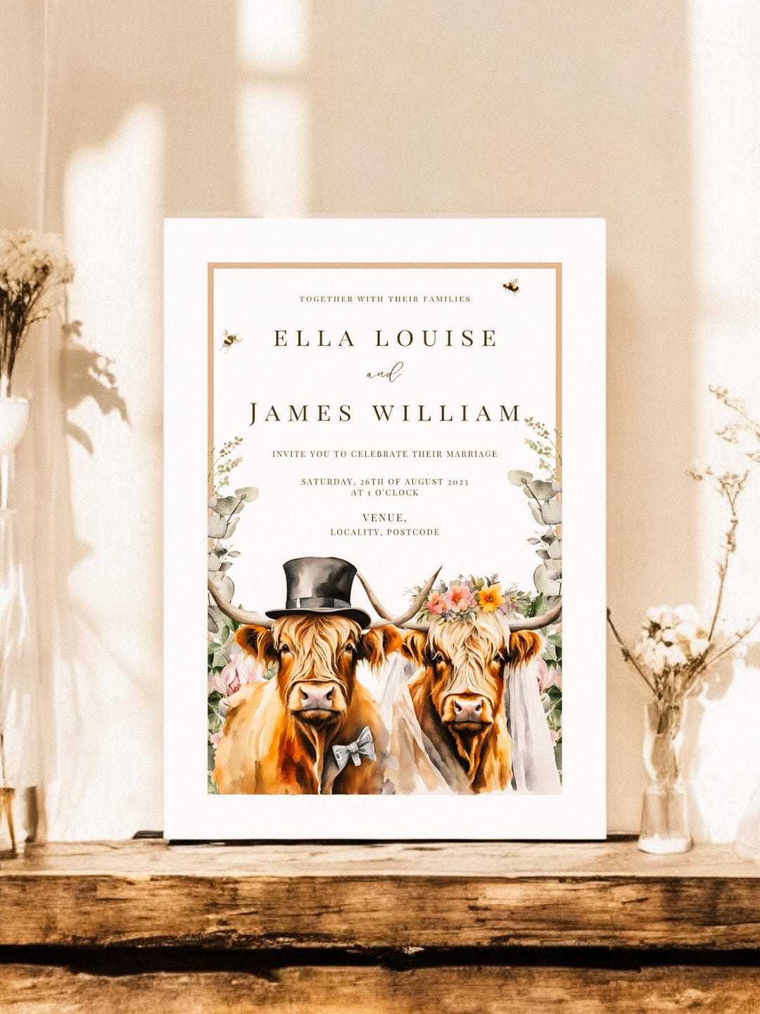 SAMPLE ONLY* Bride Groom Highland Cow, Invitation, Save the Date, RSVP ...