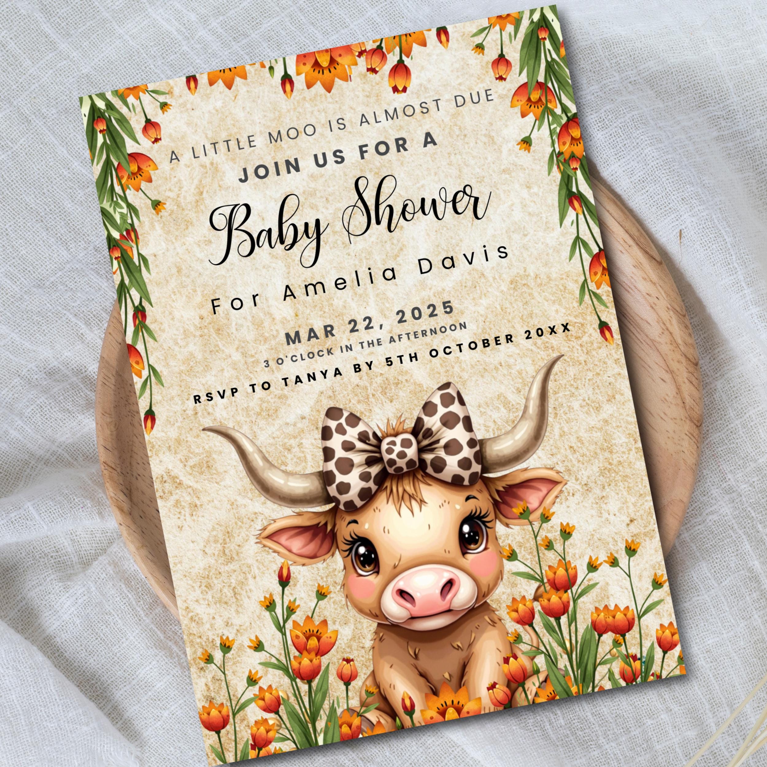 Highland Cow Editable Invitation Girl Baby Shower, Holy Cow We're ...