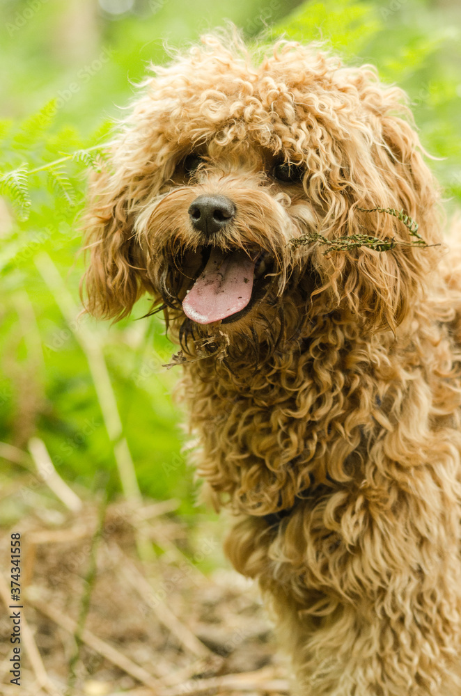 Cavapoo dog with underbite smiling and playing in the woods Stock Photo ...