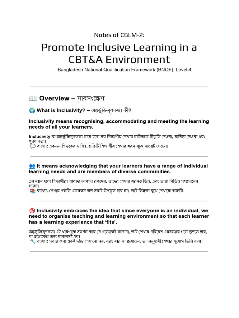 Notes of CBLM-2 - Promote Inclusive Learning in A CBT&a Environment | PDF