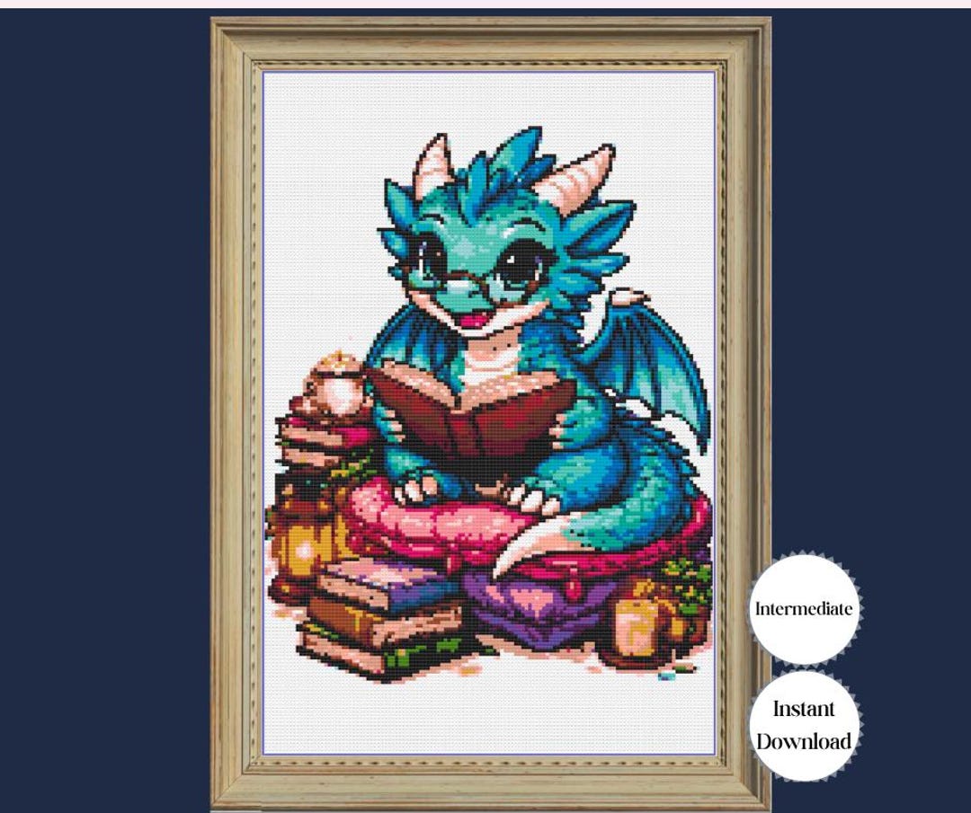 Dragon Cross Stitch Pattern PDF, Fantasy Reading Dragon Chart, Full ...