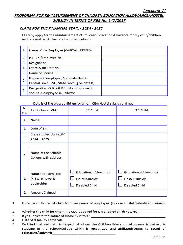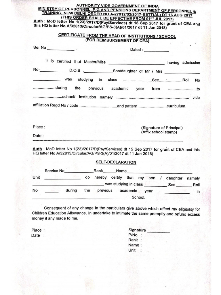 CEA reimbursement form 7th CPC | Child Education Allowance form for ...