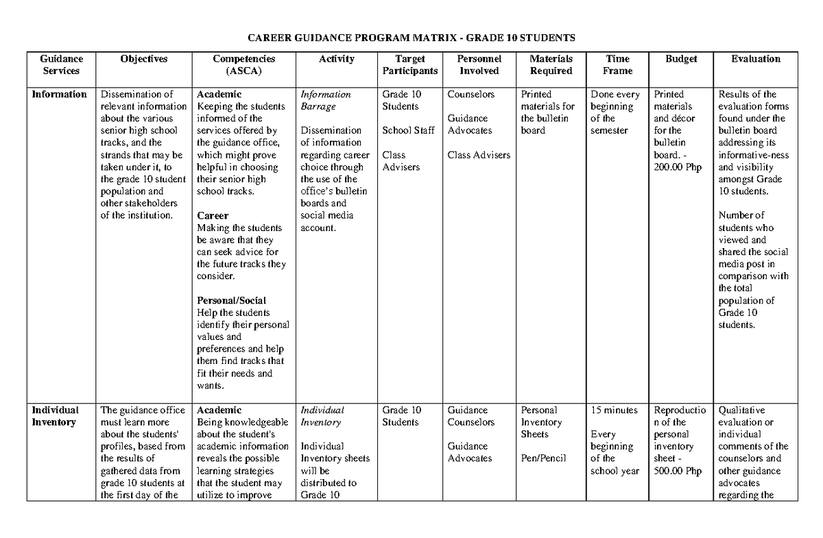 Career Guidance Program Matrix for Grade 10 Students - PR_EF524C679012 ...