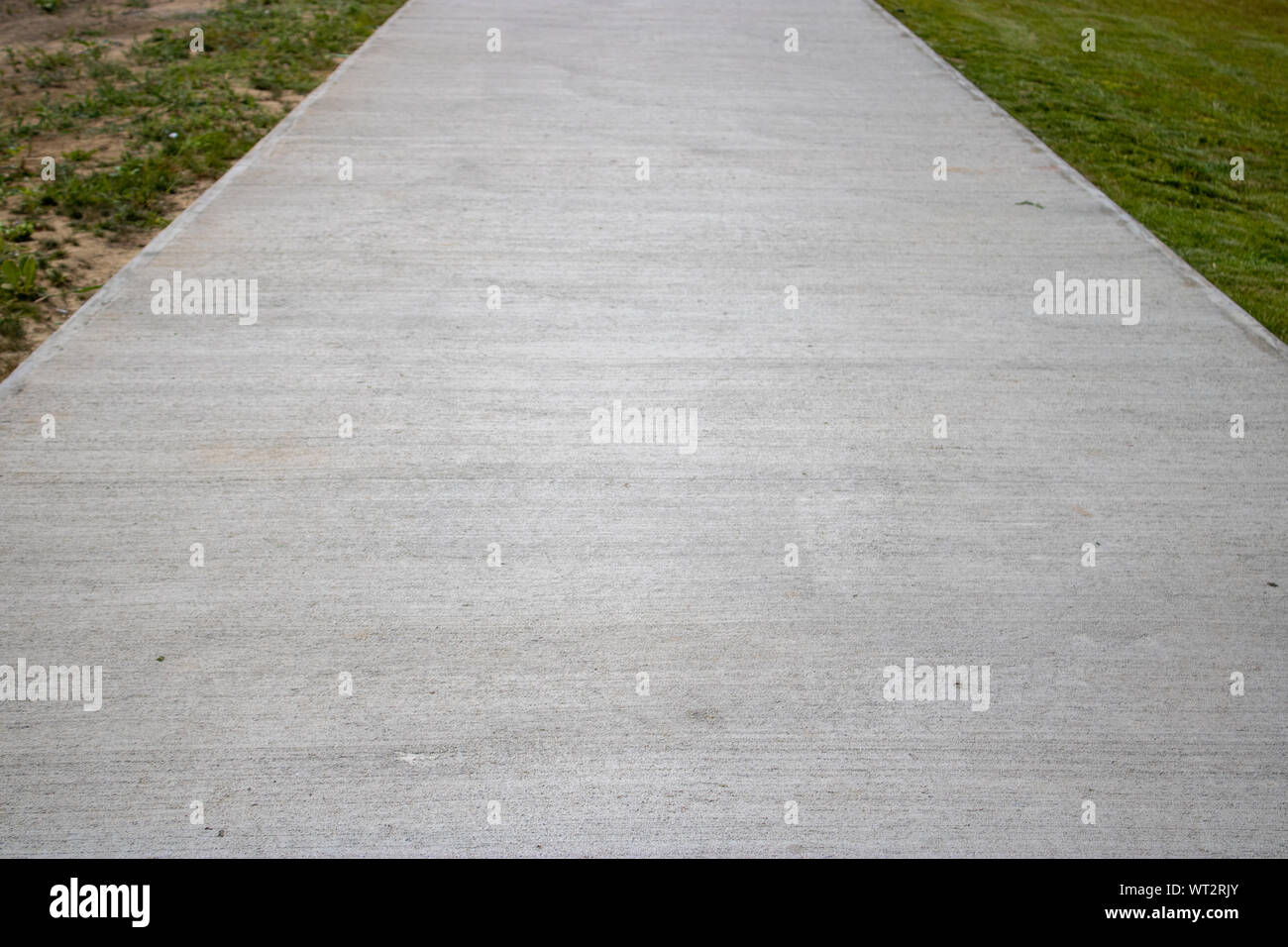 Walking path of a concrete road with grass growing on both sides ...