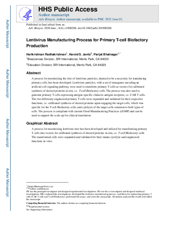 (PDF) Lentivirus Manufacturing Process for Primary T‐Cell Biofactory ...