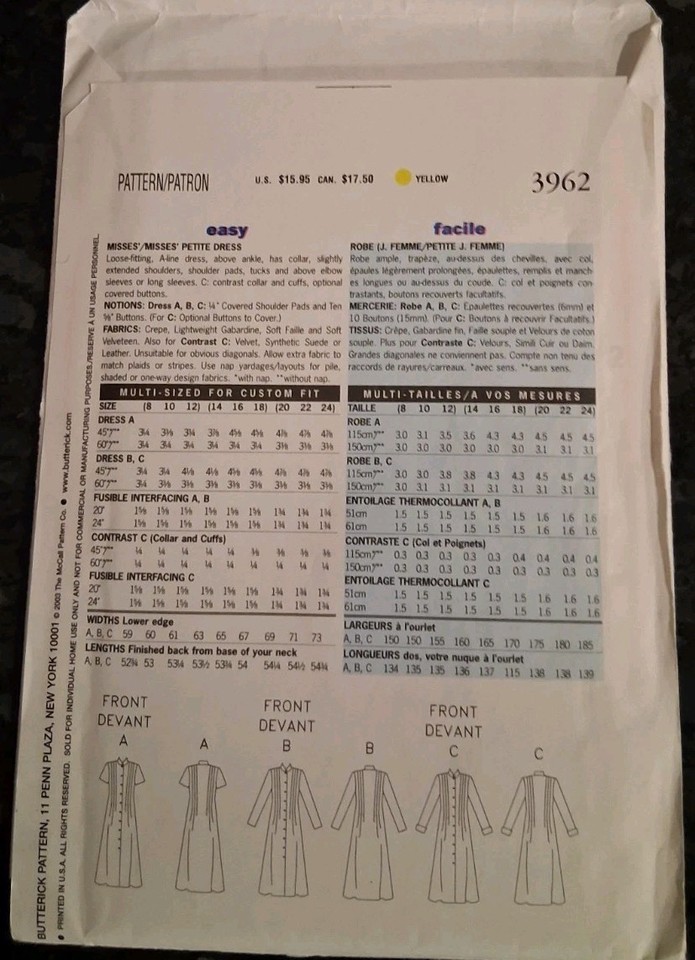 UNCUT Butterick 3962 Button Front Mandarin Collar Maxi Dress Duster ...