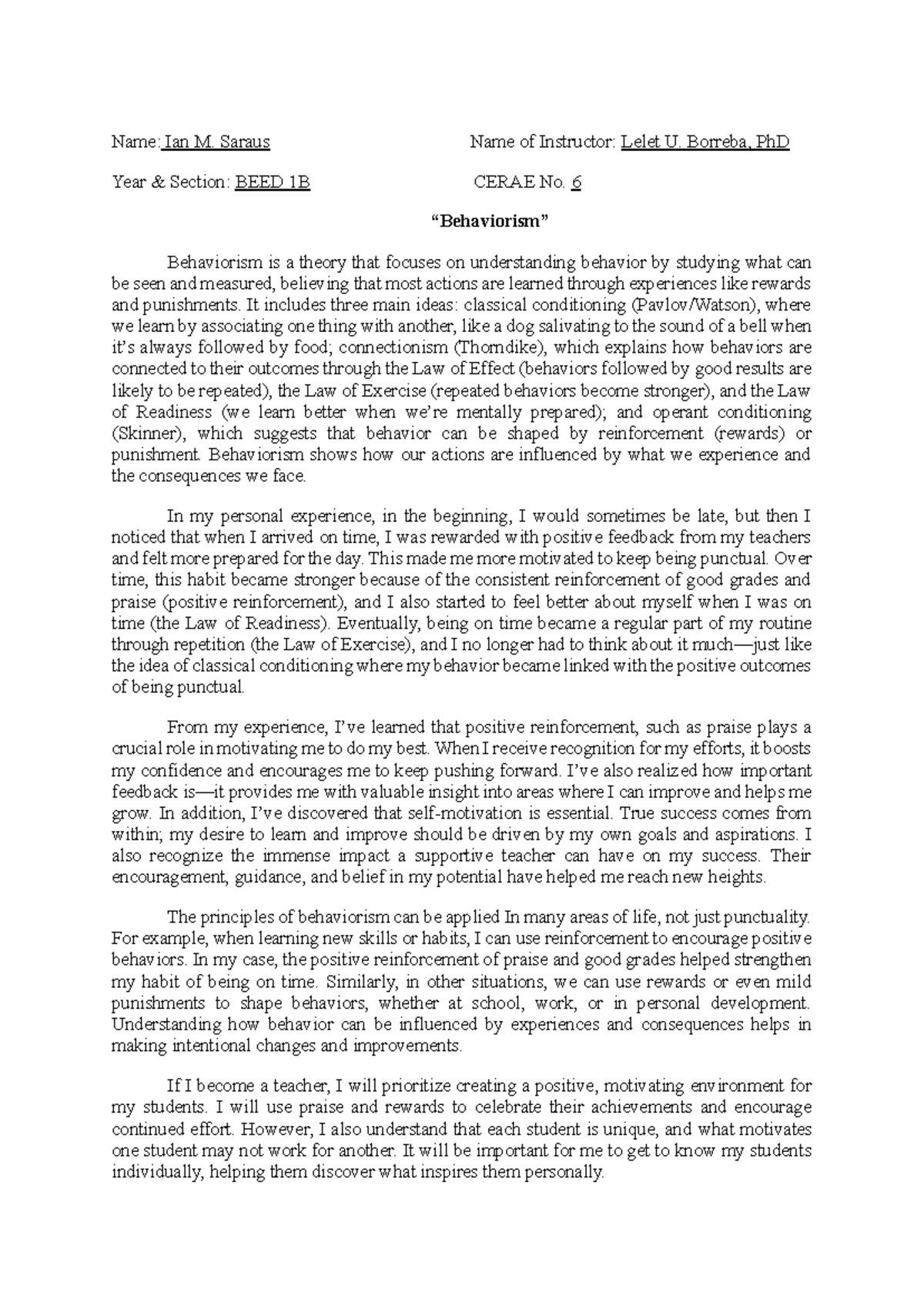 BEED 1B: Cerae No. 6 - Understanding Behaviorism Principles and ...