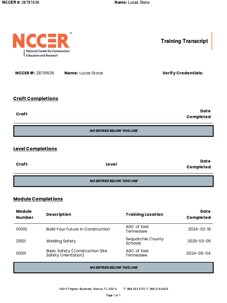Lucas Stone NCCER Training Transcript | PDF