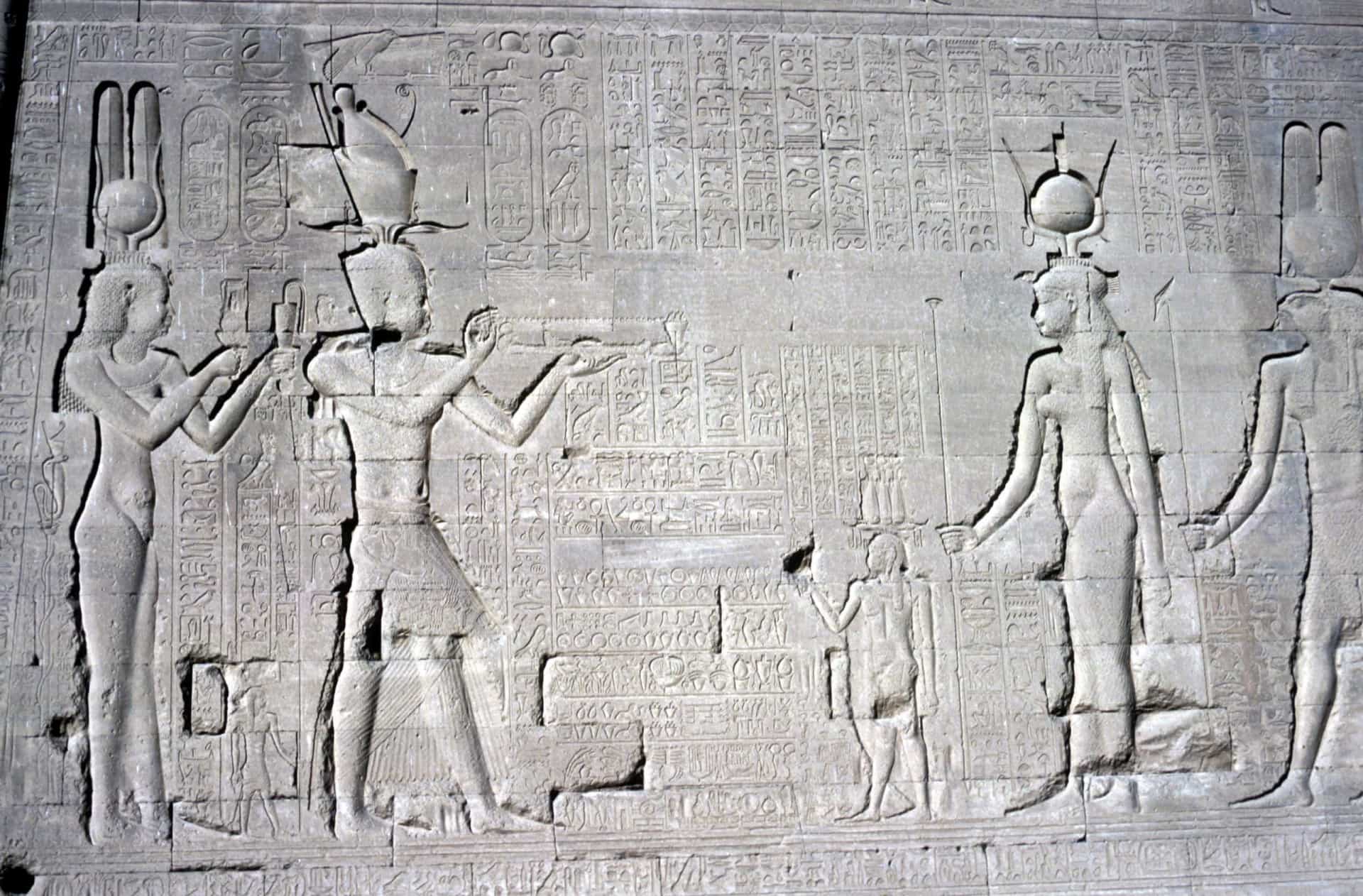 Ancient Egyptian relief carving of Caesarion offering ointment to Horus ...