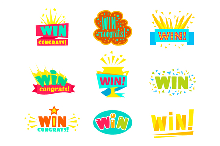 Set of stickers of Win lettering in different ways cartoon illustration ...