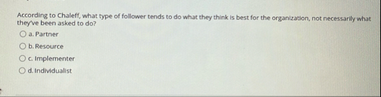 Solved According to Chaleff, what type of follower tends to | Chegg.com