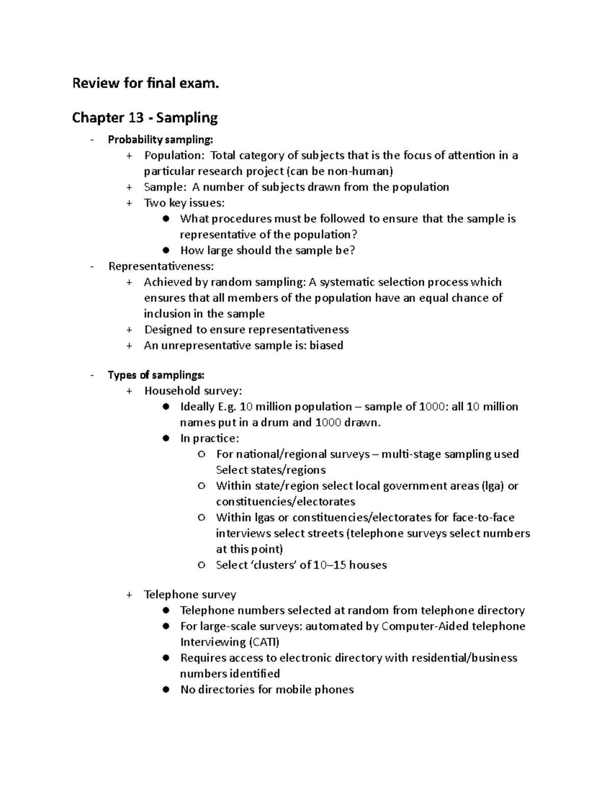Chap 13 - Exams notes - Review for final exam. Chapter 13 - Sampling ...
