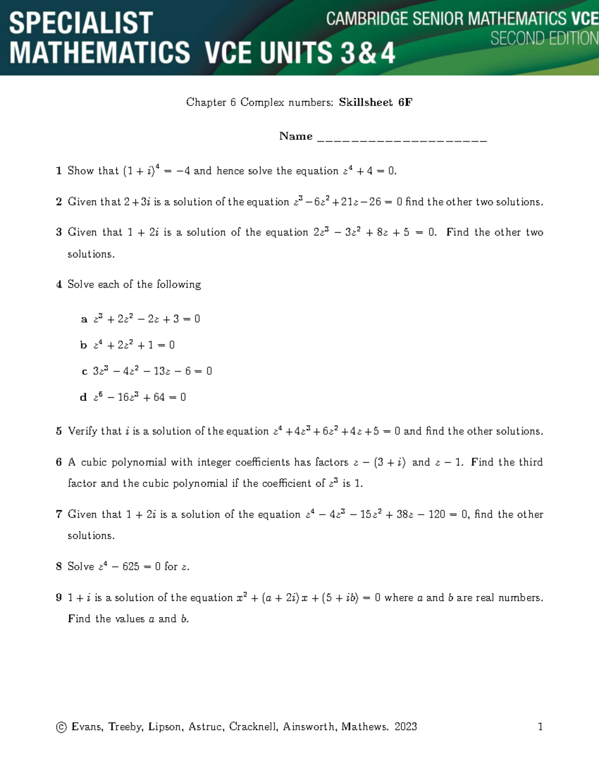 Chapter 6F: Complex Numbers Skillsheet Solutions and Exercises - Studocu
