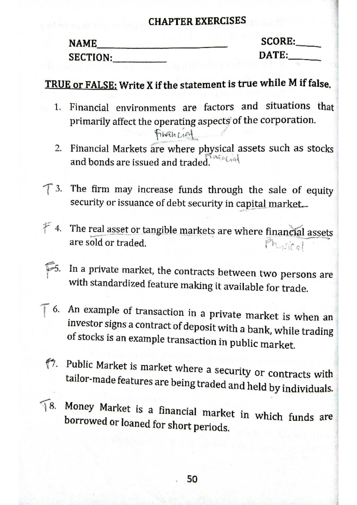 Financial Markets CHAPTER EXERCISES: True or False Assessment - Studocu