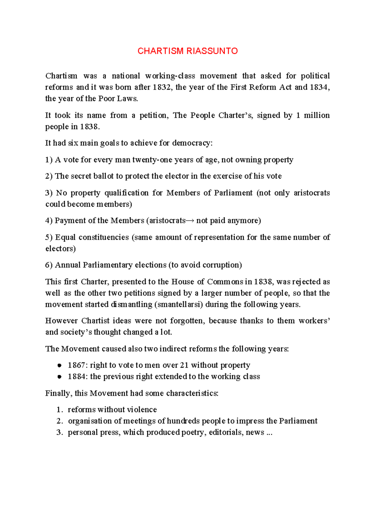Chartism Riassunto - CHARTISM RIASSUNTO Chartism was a national working ...